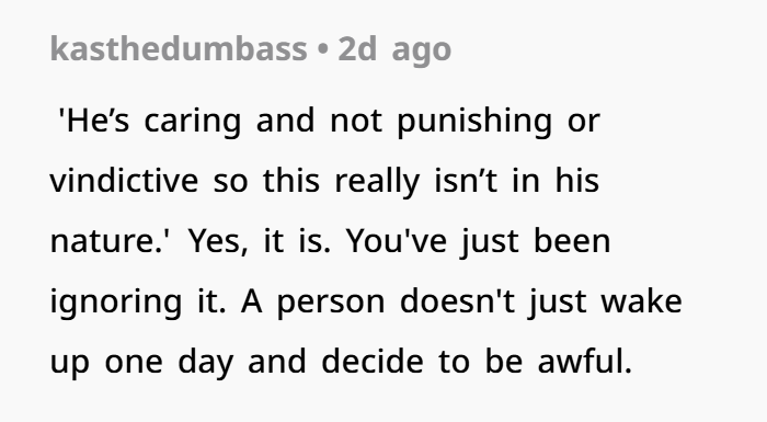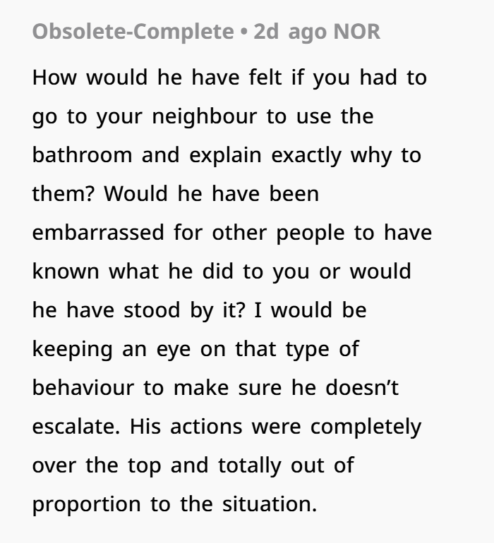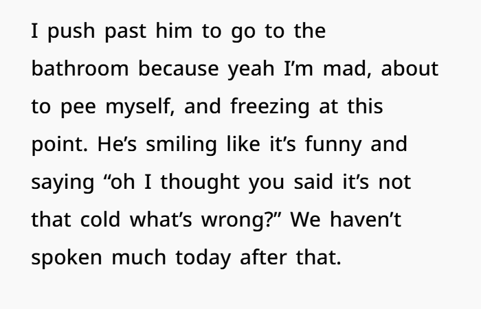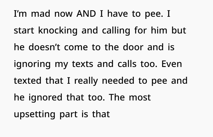 It’s easy to argue that this behavior crossed a line into emotional manipulation territory. Ignoring someone’s texts and calls, especially when they’re expressing physical distress (like needing to pee), is a serious form of neglect. It almost feels like a power move, where he’s punishing her for doing something he disagreed with. And the fact that he acted like it was funny when he finally let her in—despite her being cold, upset, and humiliated—shows a lack of empathy.