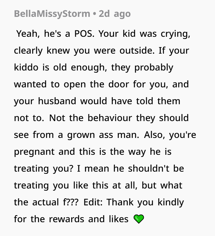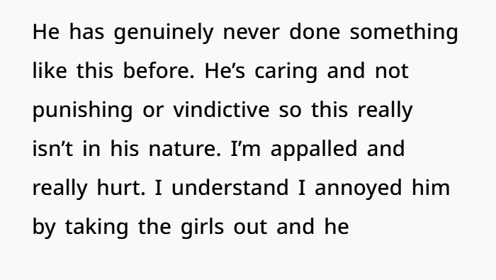 Now, here’s the kicker: He’s never done anything like this before. He’s usually a caring and thoughtful husband. So why on earth would he lock her out, especially when she was so uncomfortable and desperate to get inside? She feels hurt and appalled, not only because he ignored her pleas but also because of the way he laughed it off afterward.