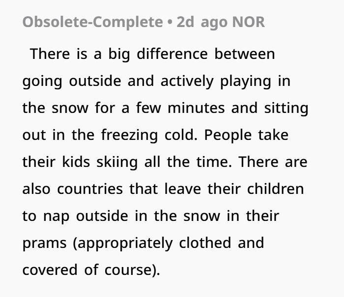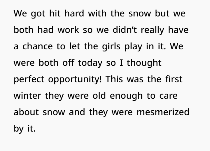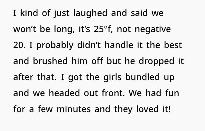 At the heart of this situation lies a classic parenting disagreement. He was worried about the kids getting sick from the cold, which is a valid concern, but she felt he was being overprotective and restricting the girls from enjoying the snow. It’s tough because both perspectives are understandable. He’s concerned about their health, and she’s excited for their first snow experience.