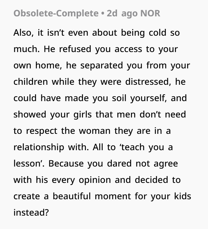 What makes this worse is the fact that their daughter was crying inside, which must have caused even more emotional turmoil for her. If he was genuinely concerned about their wellbeing, he could’ve let her back in immediately. The whole situation has an air of immaturity and thoughtlessness.
