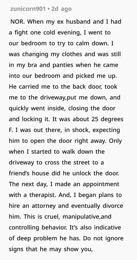 Could there be any justification for his actions? Maybe he thought the whole thing was a harmless way to prove his point about the cold and was trying to teach her a lesson. But really, is locking someone out of the house ever an appropriate way to teach a lesson? Probably not. It’s one thing to disagree with your partner, but it’s another to lock them out of the house and ignore their needs for an extended period.