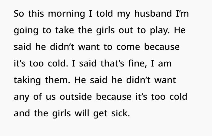 A wife shares her frustrations after her husband locked her out of the house for 25 minutes during a disagreement about their children playing in the snow. Despite the playful nature of the situation, her husband’s actions left her cold, angry, and feeling disrespected. In her post, she questions if her husband’s reaction was justified or if she overreacted.