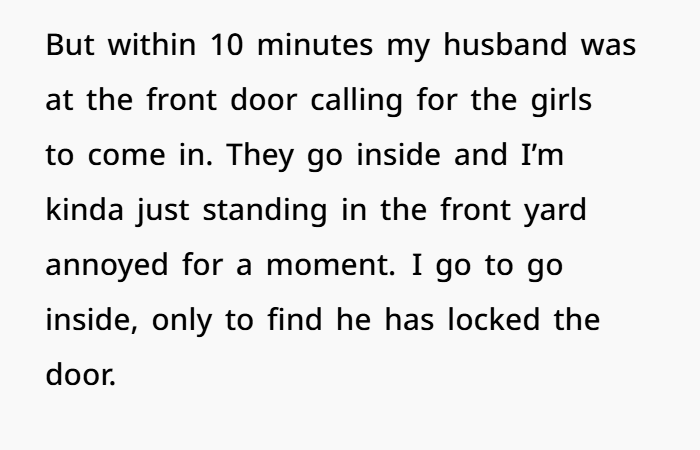 It’s crucial for couples to communicate effectively, especially when they have kids. Instead of locking someone out, they could’ve had a productive conversation about their concerns. A simple “Hey, I’m really worried about the kids getting sick,” or “Can we compromise and go inside after a few minutes?” would’ve been a more respectful approach.