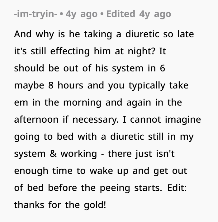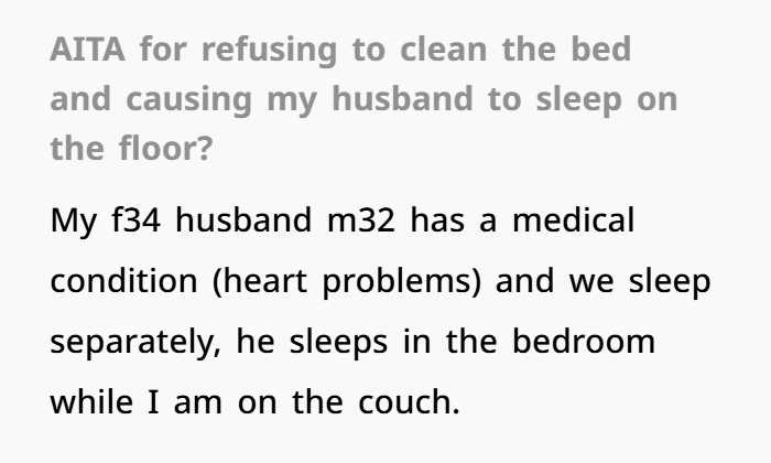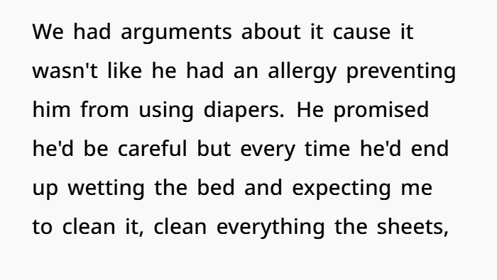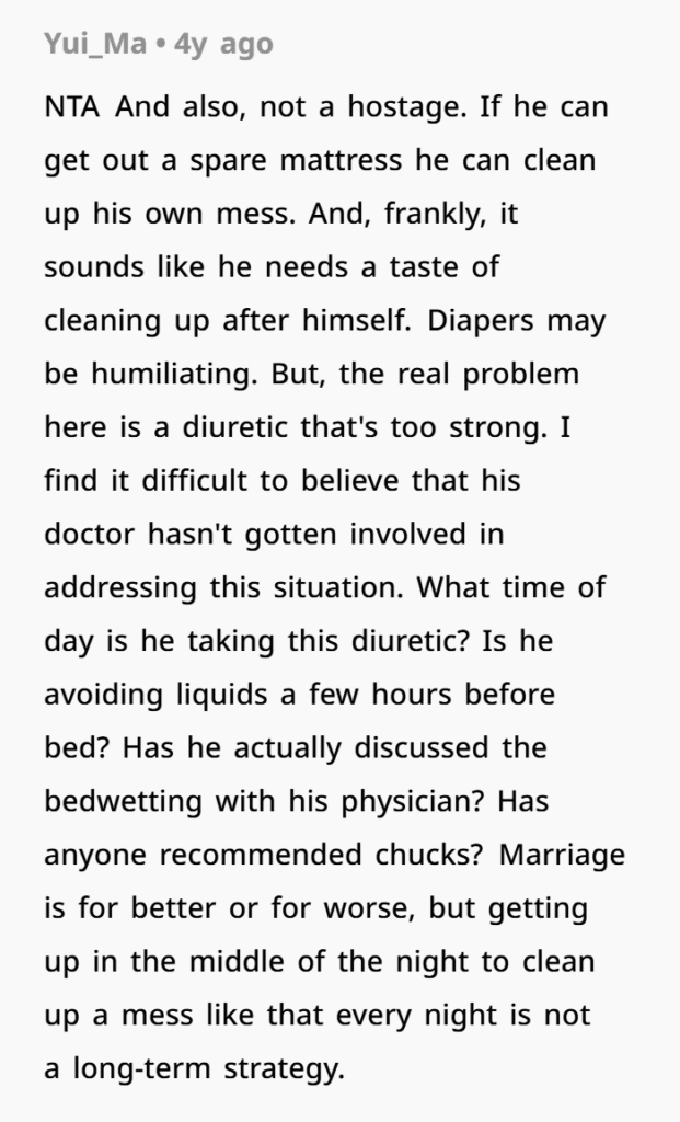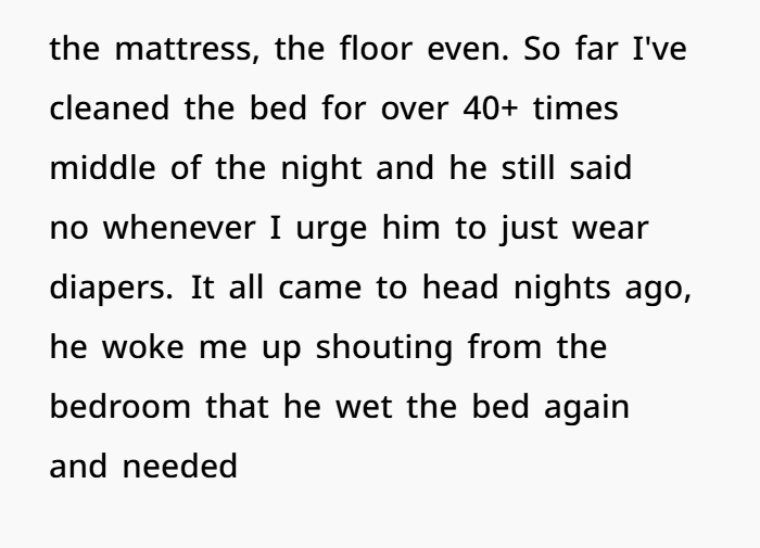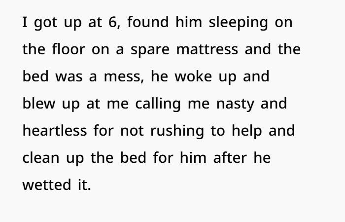 Doctors suggested adult diapers as a less invasive solution, but he refused — says it hurts his ego, makes him feel less of a man. So instead of trying that solution, he continues to wet the bed and expects OP to get up and clean it all — we’re talking mattress, sheets, floor — even at 2AM. She’s done this more than 40 times. She’s exhausted. On the most recent night, she finally hit her limit and didn’t get up when he shouted. He ended up sleeping on a spare mattress and told her she was heartless.