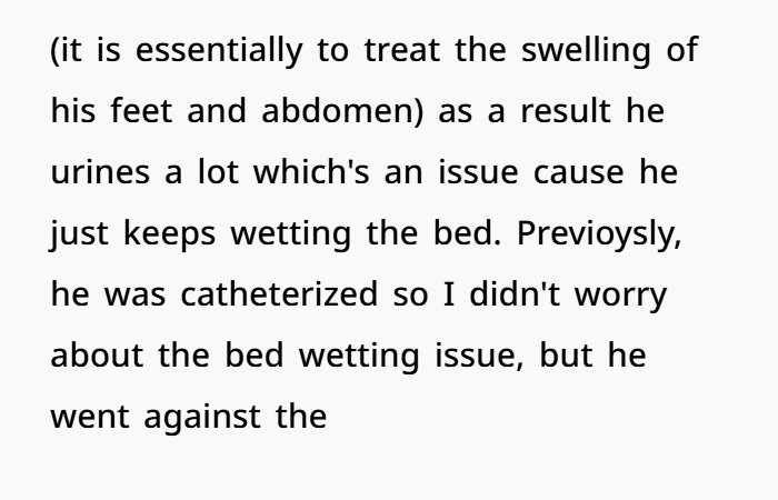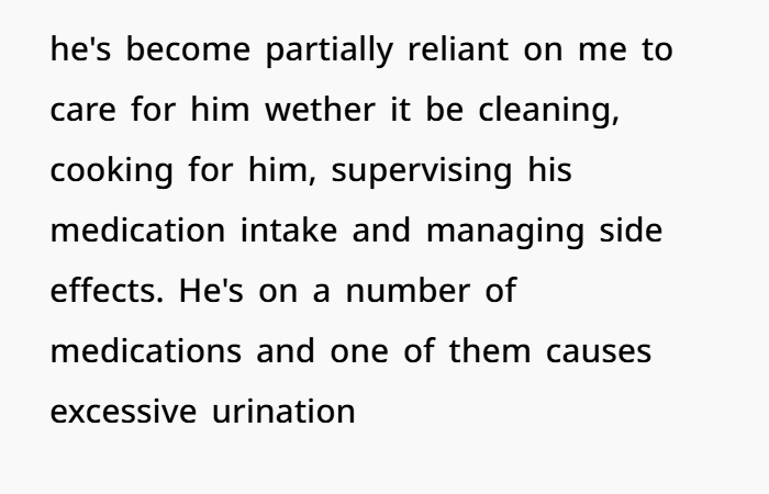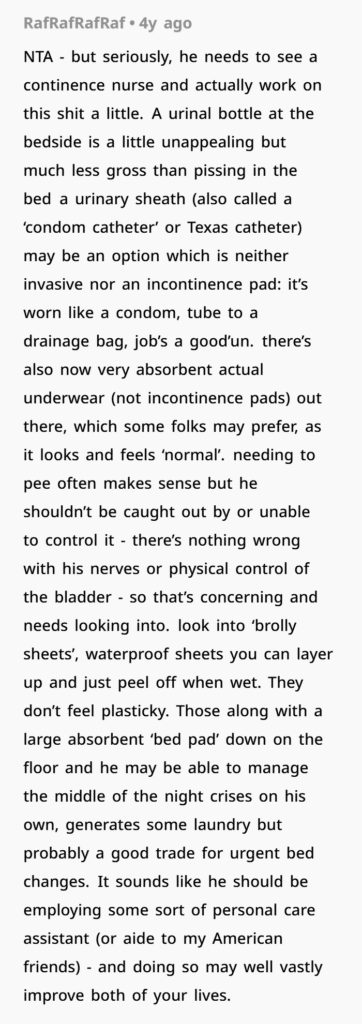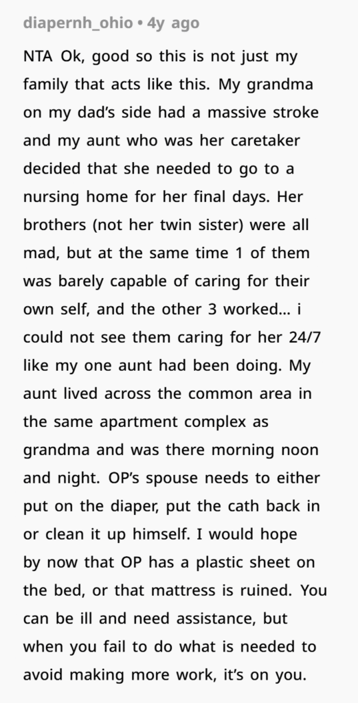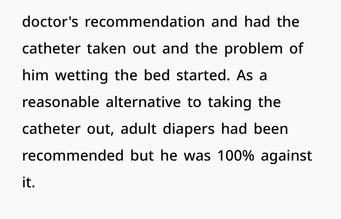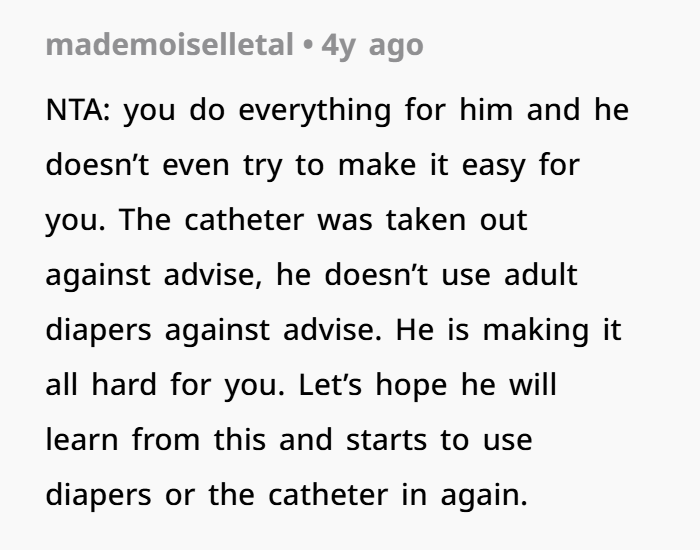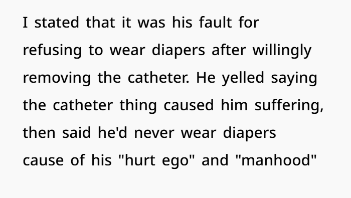 Let’s not overlook that OP’s husband removed his catheter against medical advice and then refused the alternative (diapers). This isn’t about him being helpless. He had options. Options given by medical professionals to manage his condition and preserve his dignity. But instead, he chose pride over practicality.