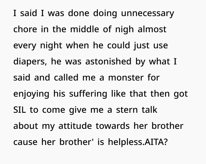It’s one thing to help someone. It’s another to be treated like staff. OP isn’t a nurse being paid to do overnight clean-ups. She’s a wife. A partner. And while “in sickness and in health” is a vow that means something, it doesn’t mean “do everything for me while I ignore solutions and demand more.”