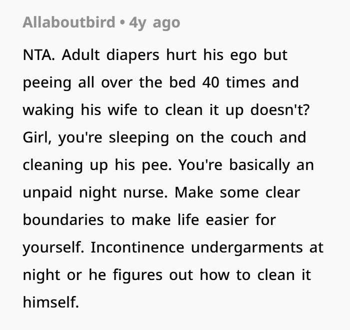His refusal isn’t just a personal decision — it has a direct, burdensome impact on his wife. His “manhood” doesn’t get to override her right to sleep, peace, and health. Wearing adult diapers isn’t shameful. It’s a responsible health decision. Denying them while expecting others to clean up? That’s entitlement.