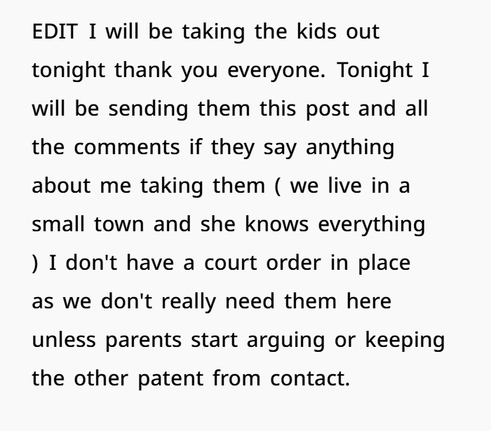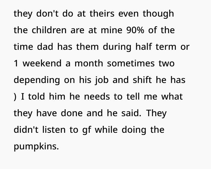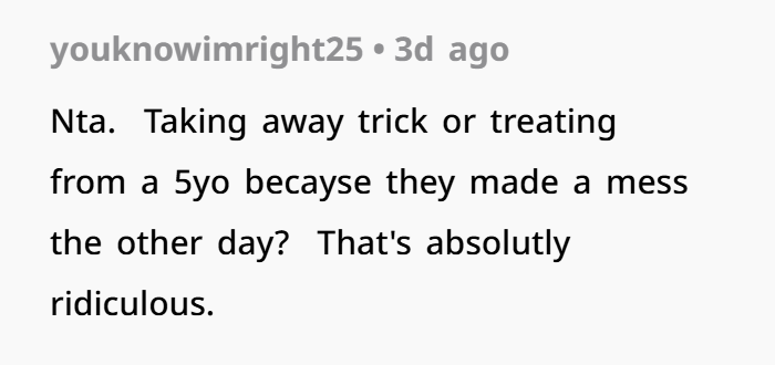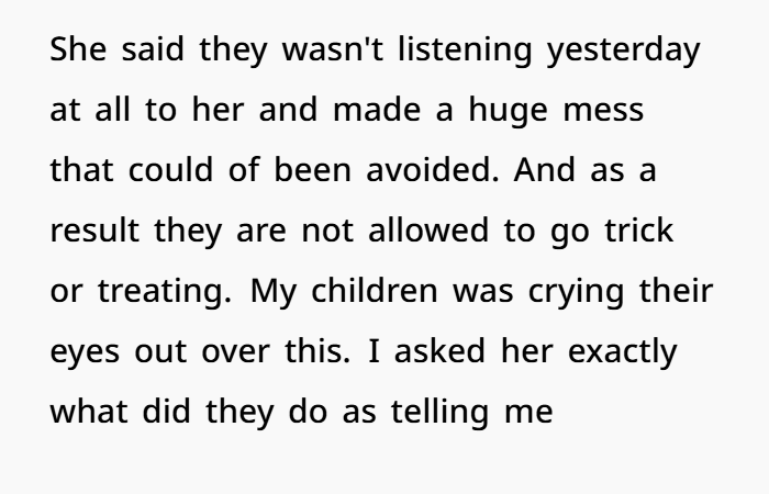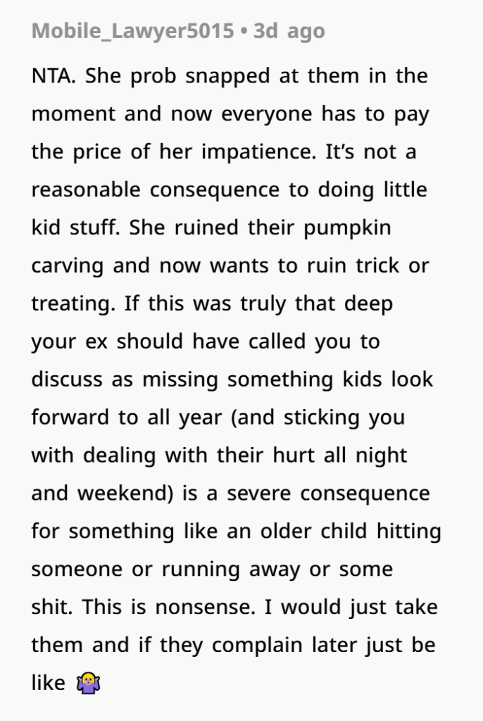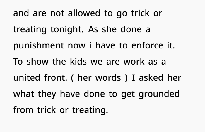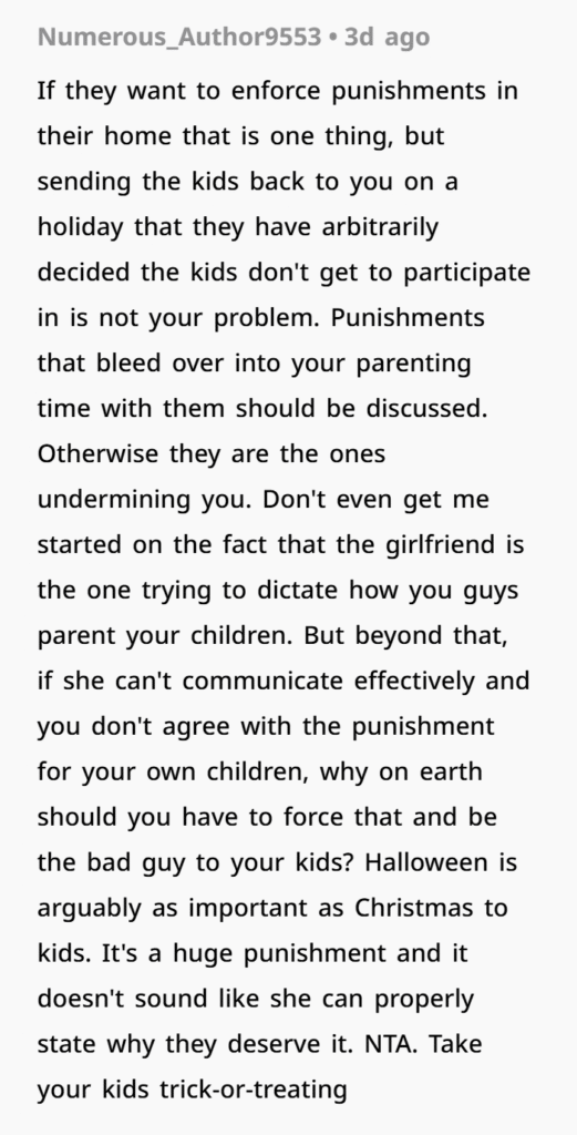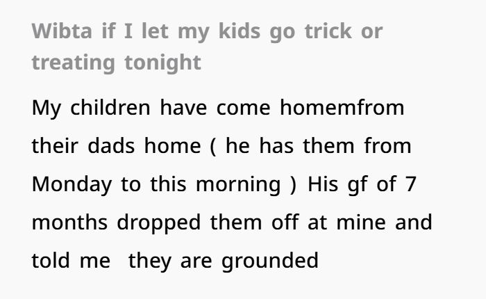 The poster’s kids returned from her ex, and his girlfriend said that they were punishing the children by banning them from trick-or-treating