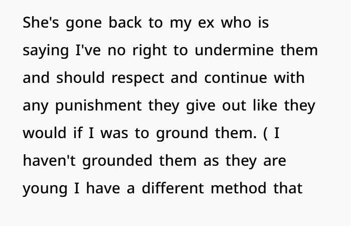 4. Keep the communication open: After tonight, speak with your ex / gf about how discipline will be handled in the future. Maybe set a simple “if we send the children over grounded we must send you written/ verbal note explaining reason so everyone’s clear”.