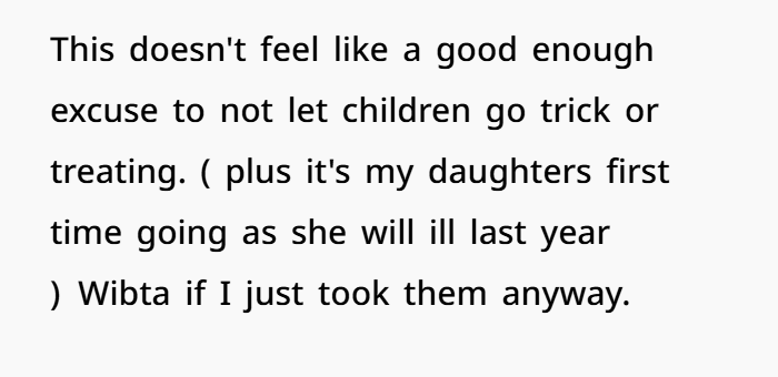 In my opinion — no, you wouldn’t automatically be the asshole if you took them trick‑or‑treating, given the circumstances. You have good reason: children’s ages, unclear punishment rationale, first time for daughter, the holiday context. But that doesn’t mean there’s no downside. It’s a nuanced decision.