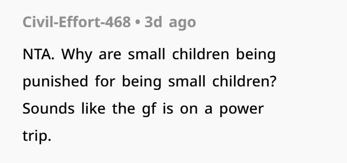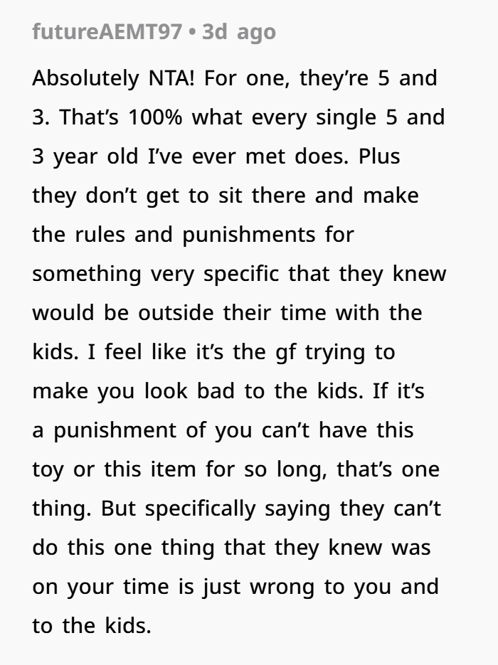 You feel like the punishment doesn’t quite match what happened (5‑yr‑old with attention difficulties, 3‑yr‑old who hyper‑focuses on lego) and you’re wondering if you’d be the “bad guy” if you ignore the grounding and take them out anyway. You also mention there’s no court order compelling you to uphold punishments set by the dad’s girlfriend, and you’ve got the kids 90% of the time. On the other hand, you don’t want to be undermining joint parenting or appear to be “going rogue.”