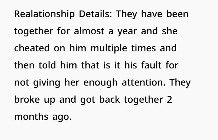 First, let’s talk about him. This guy is clearly in what most people would call a toxic relationship dynamic. His girlfriend cheated multiple times, blamed him for it, and now—ironically—she’s the one being controlling and suspicious. That kind of behavior lines up with patterns seen in unhealthy relationships: blame-shifting, control, emotional volatility. Anyone in that situation is probably drained, confused, and looking for some kind of emotional escape.