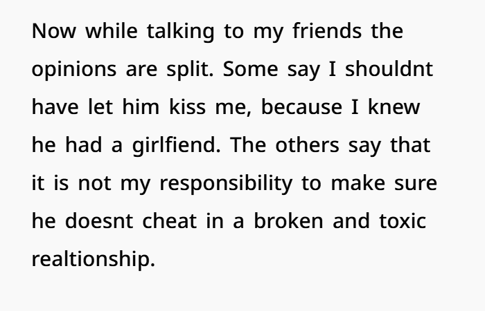 The turning point came after he vented to you about his toxic relationship—cheating, control, constant arguments—and during a quiet moment, he leaned in and kissed you. You didn’t initiate it, but you also didn’t stop it. Now you’re stuck wondering if that makes you equally responsible. Some friends say you crossed a line, others say it wasn’t your job to manage his relationship. And honestly, that’s exactly why this feels so complicated—because both sides have a point.