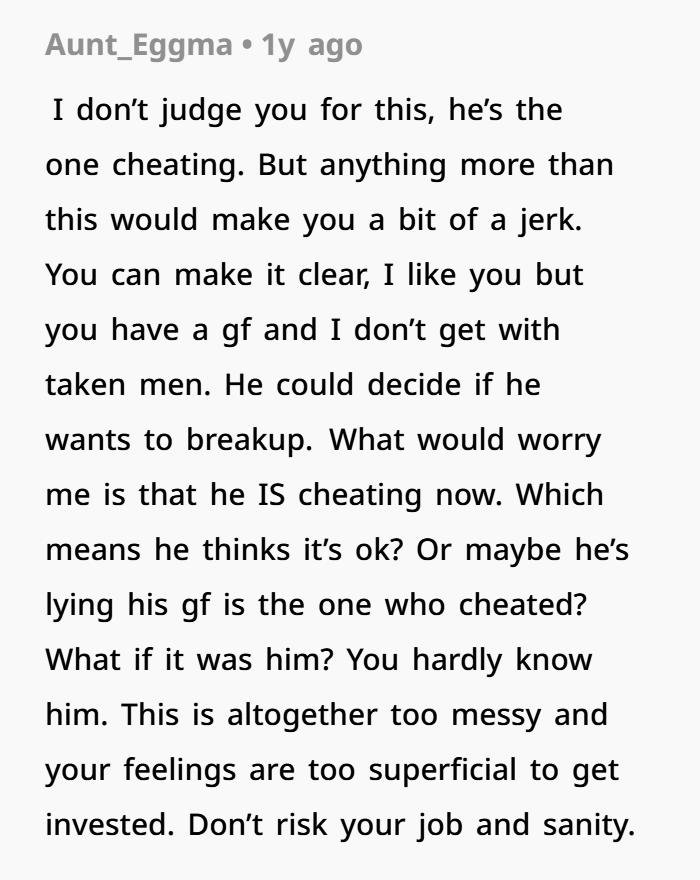 Also, consider this: you’re currently in a shared work environment for weeks. That adds another layer of risk—awkwardness, tension, potential drama if things escalate or if his girlfriend finds out. Workplace-adjacent situations can get messy fast, especially when emotions are involved.