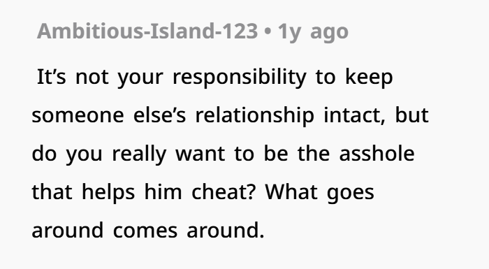 But socially and ethically, there’s also something called respecting relational boundaries. Even if you’re not the one in the relationship, knowingly participating in crossing those boundaries can still feel… off. Not illegal, not unforgivable—but not totally clean either.