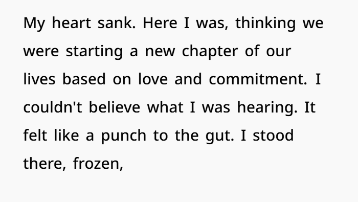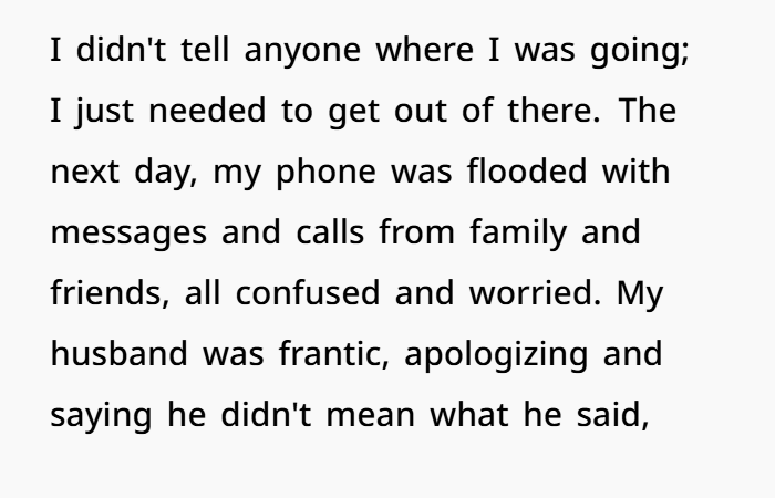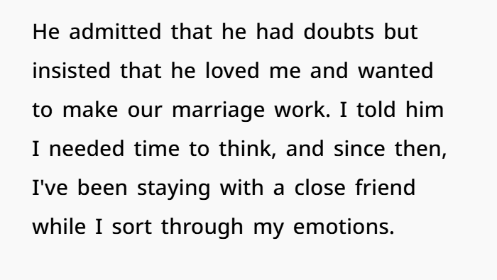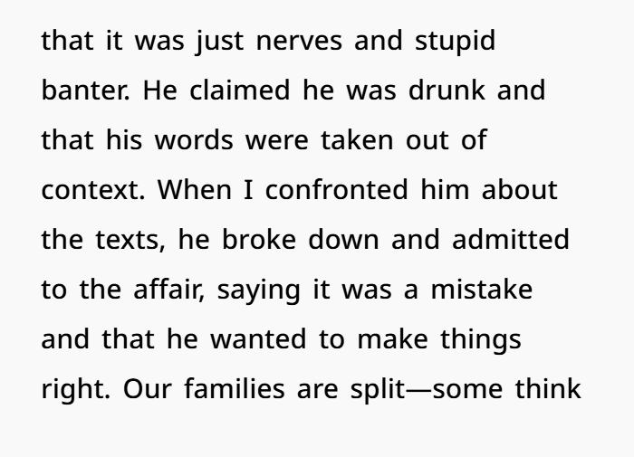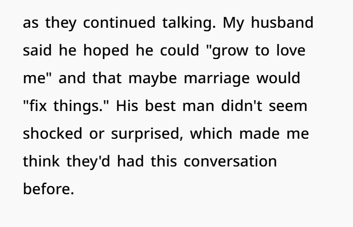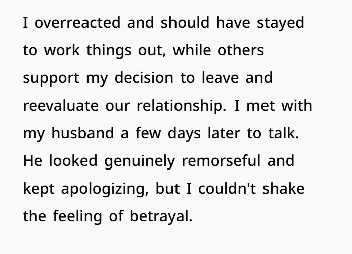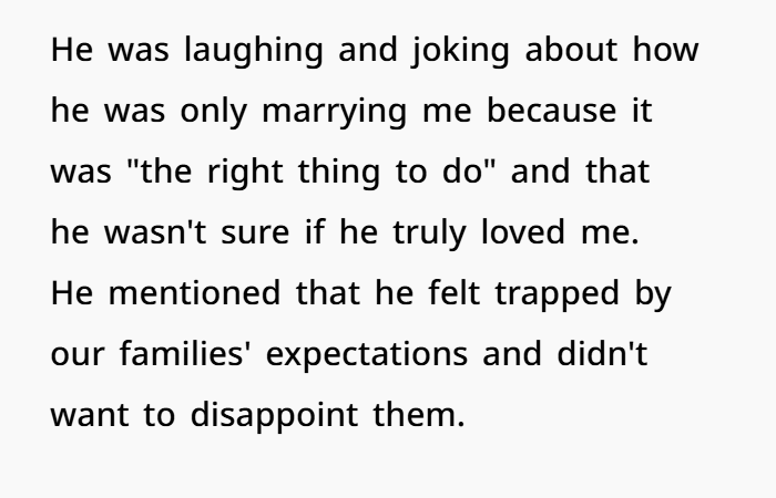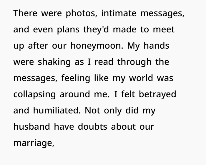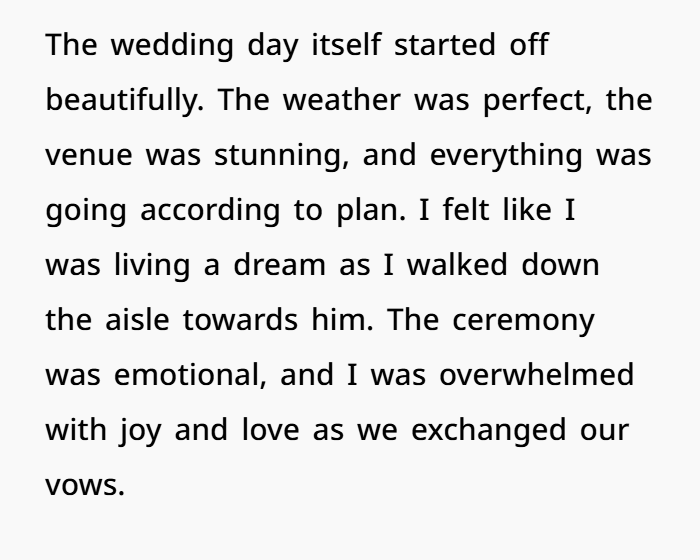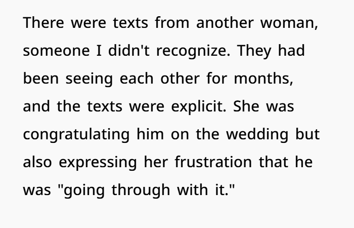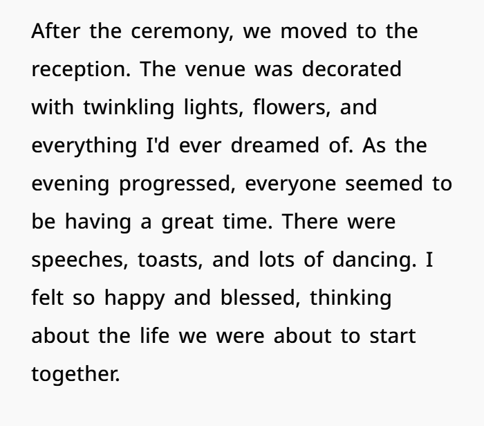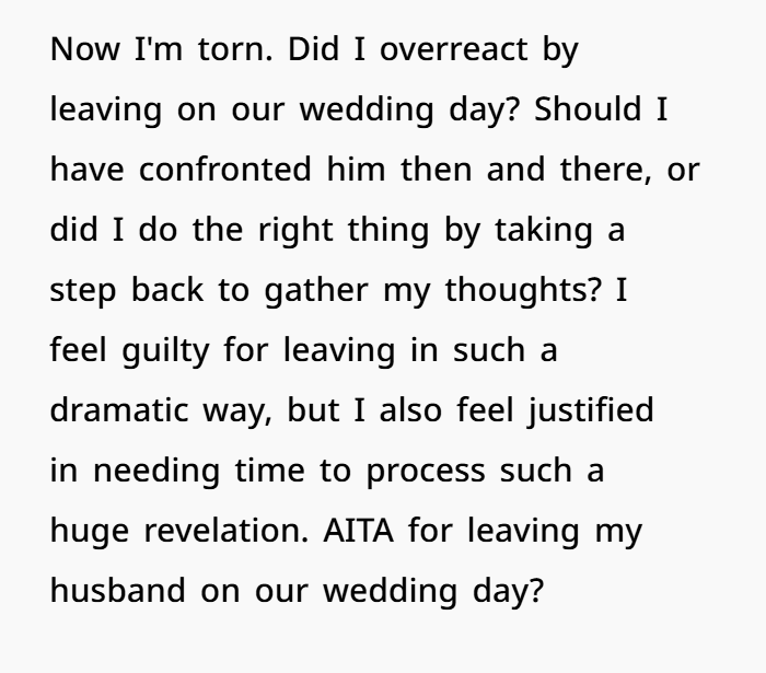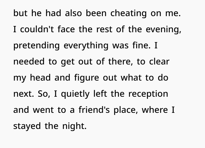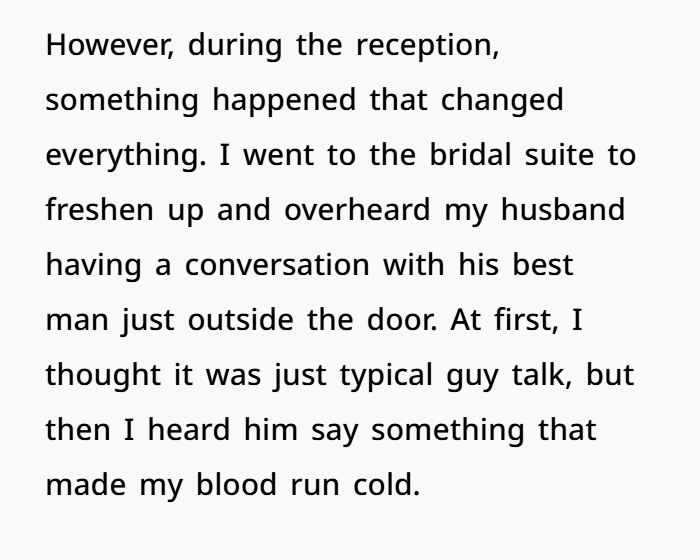 During the reception, OP overheard a shocking conversation between her husband and his best man. He confessed that he didn’t really love her, only marrying her out of obligation and pressure from their families. Reeling, she returned to the bridal suite, only to discover even more devastating proof: texts from another woman—his mistress. Heartbroken and overwhelmed, she quietly left the reception without a word, seeking refuge with a friend while she processed everything. Now, OP is left questioning: was she wrong for walking away without confrontation?