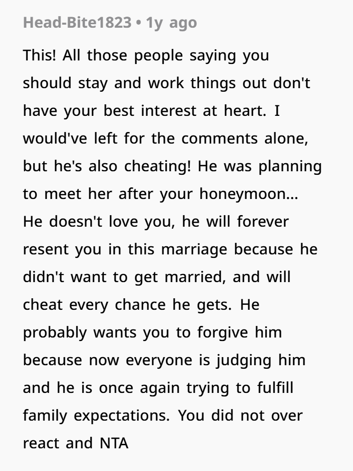 - “Cheating before the wedding? And planning to keep going? Nah. You did the right thing.”