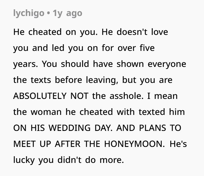 OP didn’t ruin her wedding day—he did. With his words. With his actions. With his choices. She reacted like any emotionally intelligent person would when faced with lies and betrayal.