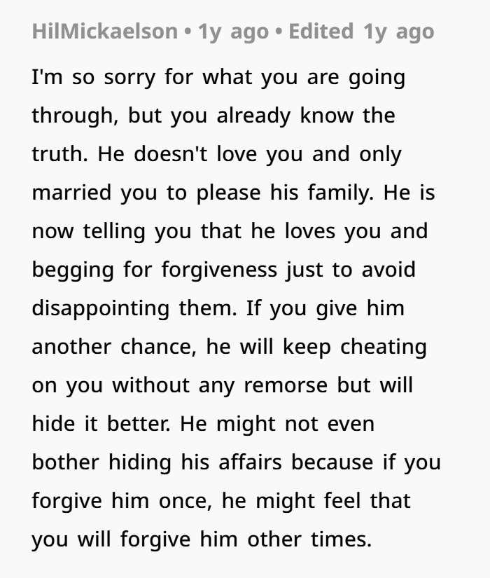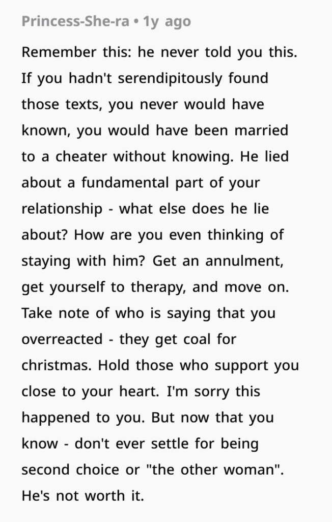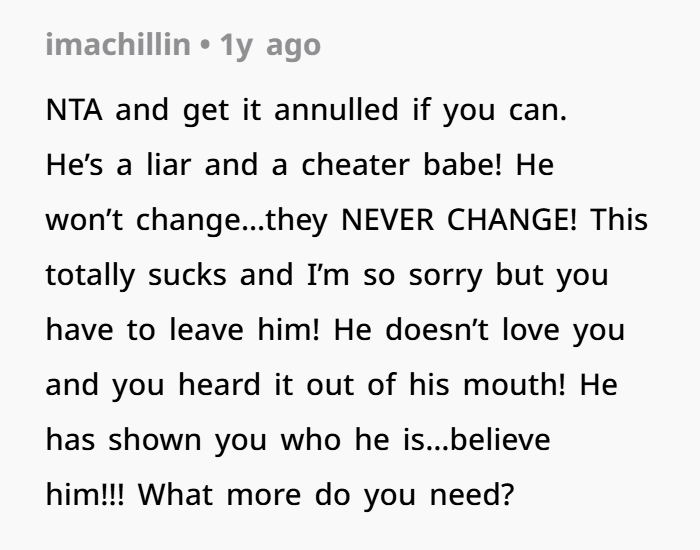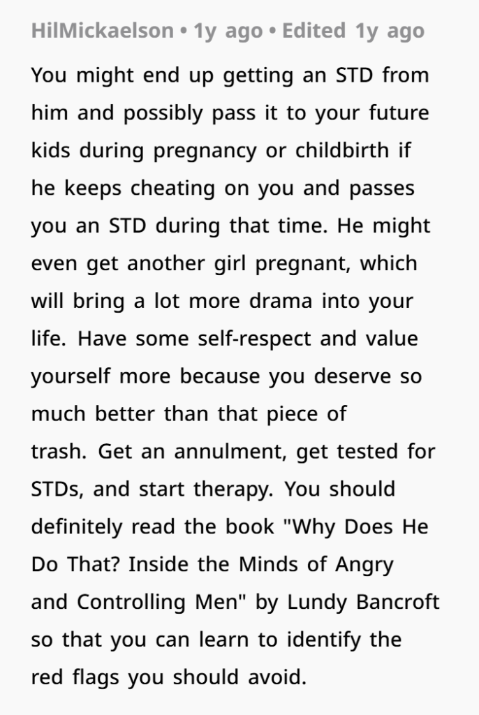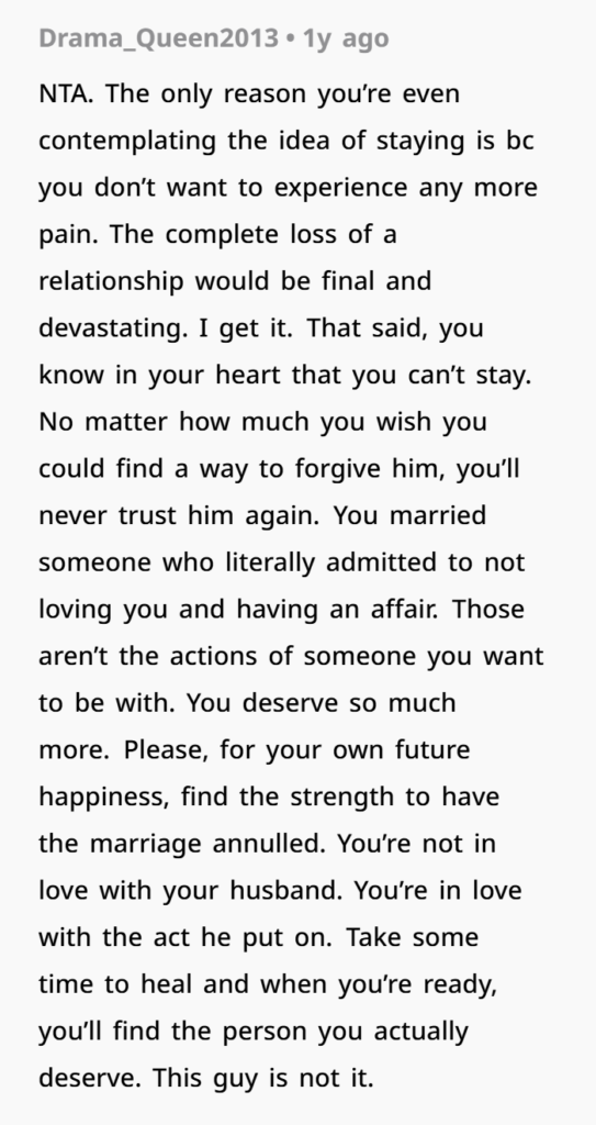 Whether she decides to annul the marriage, file for divorce, or try therapy with him, it’s her choice. Not her family’s. Not her friends’. Not even Reddit’s.