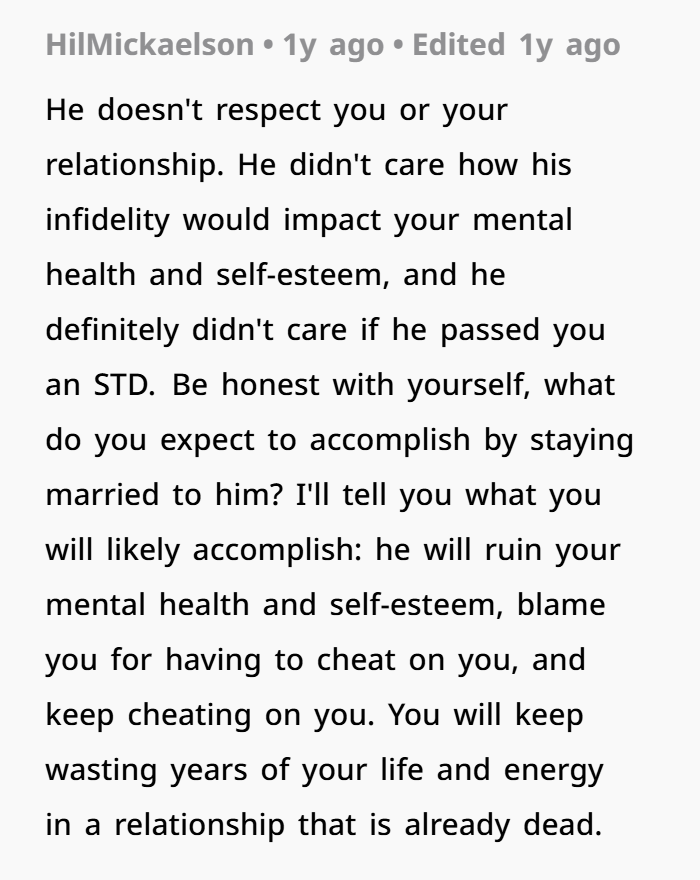 Even if he’s remorseful now, words aren’t enough. Is he willing to do the real work—therapy, accountability, breaking off contact with the other woman?