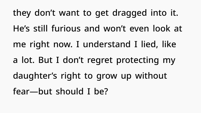 Let’s be honest—lying is still lying. And the mom did keep a lot from her husband. Not one little fib, but a pattern of secrecy. From dating to parties, she made a decision: protect the kids, not the co-parenting bond.