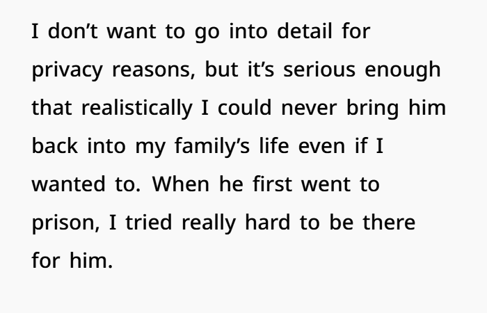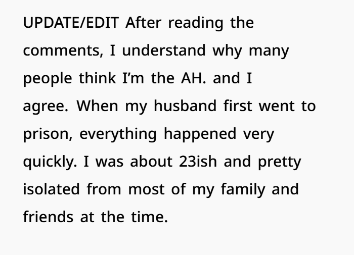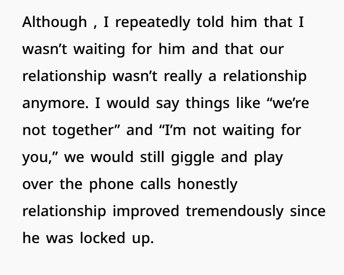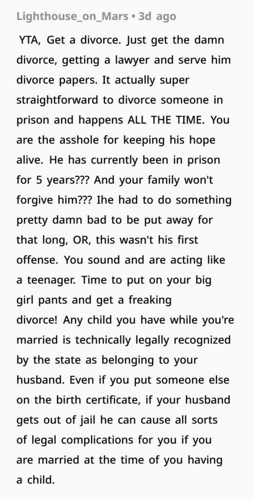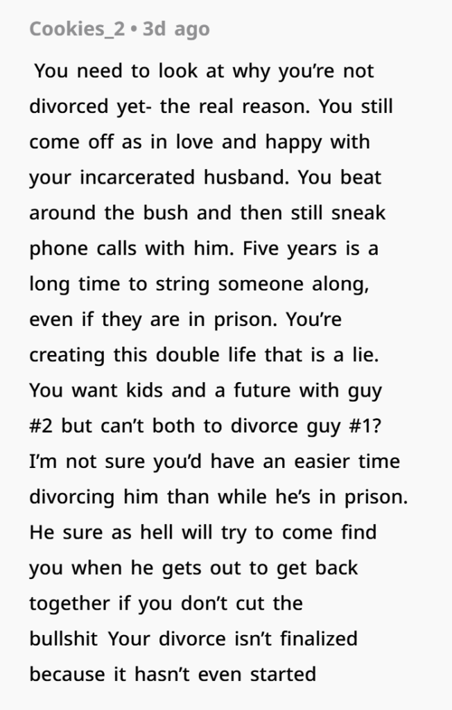 The woman explained that when her husband first went to prison, she tried to stay loyal and supportive. For about three years she spoke with him almost daily, helped him financially, and remained emotionally present in his life. But over time things changed. She repeatedly told him she wasn’t waiting for him and that their relationship was basically over. Eventually she reconnected with an old high school boyfriend, and that relationship grew into something serious. Now they live together and are planning a future — including having a baby. The only thing still tying her to the past is the legal paperwork of a divorce she never finished filing.