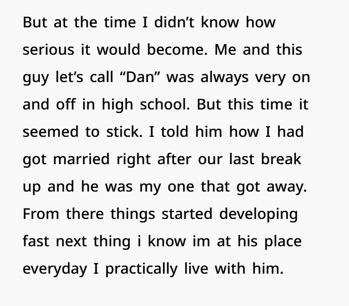 That relationship slowly turned serious. What started as catching up eventually became a full relationship. Before she realized it, she was spending nearly every day at his place and eventually moved in with him. From her perspective, that relationship became her real life.
