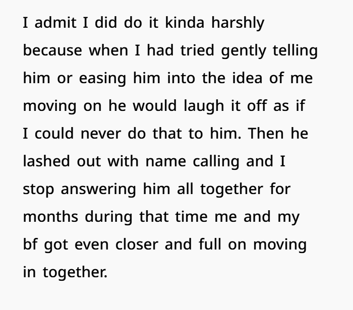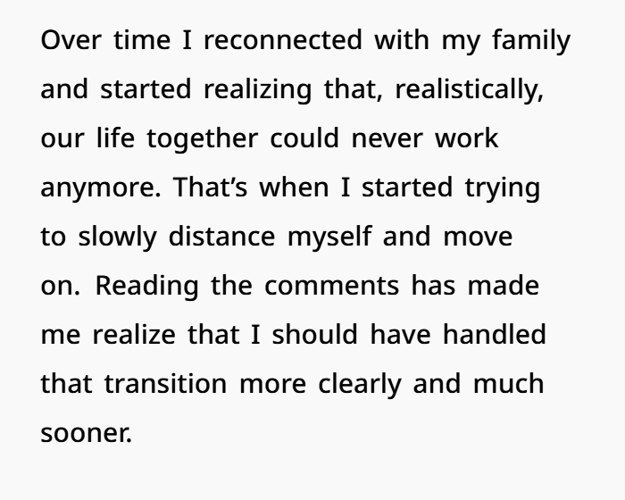 And interestingly, the woman herself acknowledged some responsibility after reading feedback. She admitted that she probably should have made a cleaner break earlier and communicated more clearly.