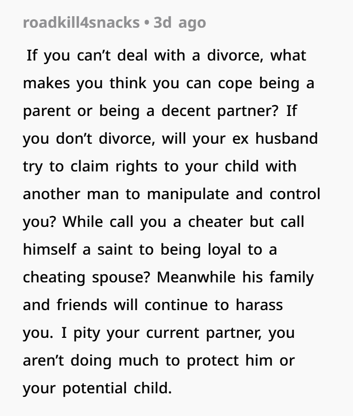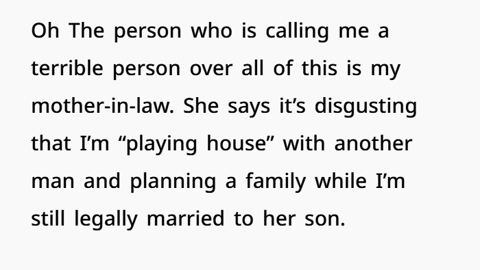 But from the outside looking in, the optics look rough. She’s still legally married while living with another man and planning a baby. For her mother-in-law, that looks like betrayal.