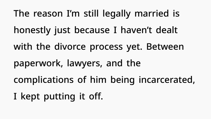 From her point of view, the marriage ended years ago emotionally. The only reason it still exists is because she never completed the divorce paperwork. Anyone who has gone through divorce proceedings or family court filings knows how overwhelming they can be — especially when one spouse is incarcerated.