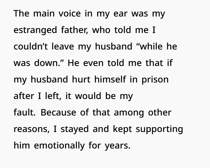 Another layer here is social pressure. When her husband first went to prison, she said she was encouraged to stay loyal by her estranged father. He even told her that if her husband harmed himself after she left, it would be her fault. That kind of pressure can trap someone in a relationship long after it has emotionally ended.