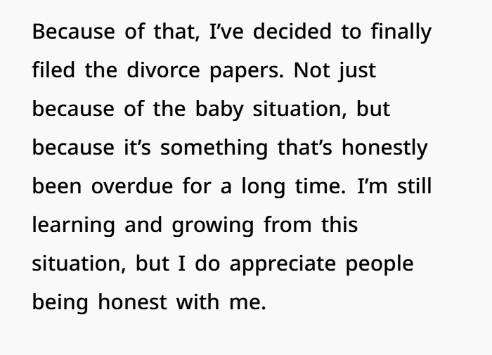 The biggest turning point in the story is that she ultimately decided to file for divorce. Not just because of the baby plans, but because she realized it should have happened long ago.