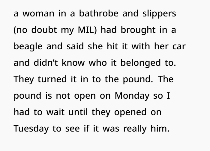 About a year later, my mother-in-law called me crying. She said Winston had a seizure and the emergency vet had to euthanize him. The story felt off right away. She added strange details. Said the animal hospital didn’t even charge for the pet euthanasia services because they felt sorry for her. That didn’t make sense. I started calling around to local veterinary clinics. Their regular vet hadn’t treated him. Finally, another animal clinic called me back. A woman had brought in a beagle, claimed she hit him with her car, and said she didn’t know the owner. He was marked as a stray and turned over to animal control services. Four days later, I walked into the county animal shelter and heard Winston baying from his kennel. He was alive. Terrified. Abandoned again. And that sound still stays with me.