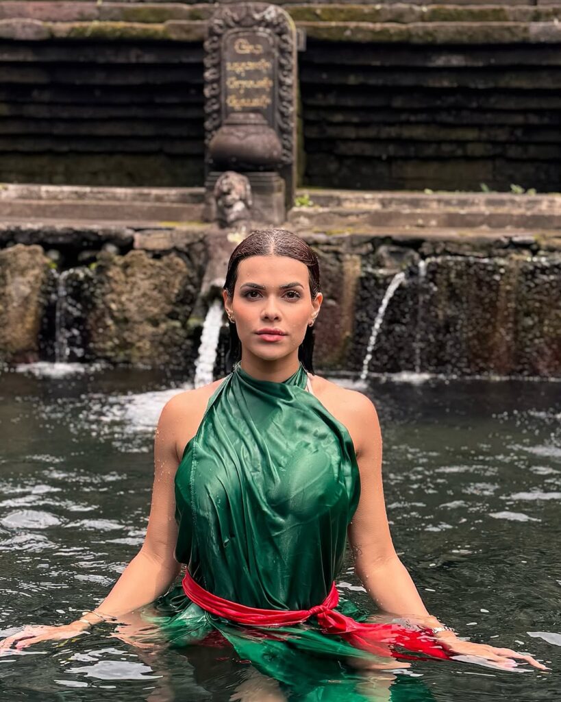 Luana shared a series of steamy pictures where she rocked a white translucent wrap-around skirt and a headscarf, covering her chest with just her hand. In the caption (written in Portuguese), she quoted, “The beauty of the desert is that it hides a water well anywhere…” — a line inspired by Antoine de Saint-Exupéry.