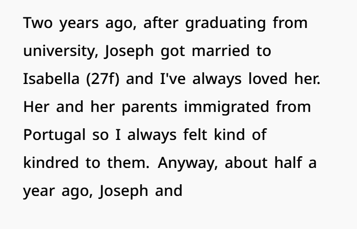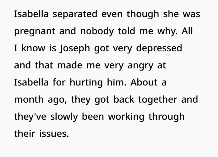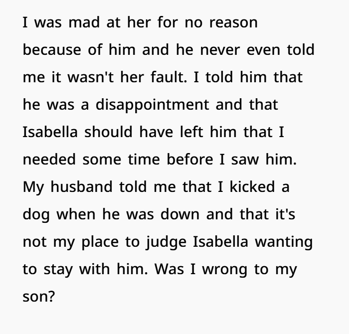 The backstory sets the stage: Joseph, the 25-year-old son, had been married to Isabella, whom his mother adored. After a brief separation, Joseph confessed to the infidelity, which led to a dramatic confrontation with his mother. The mother, feeling betrayed, lashed out and voiced her hurt by calling him a disappointment, which left her conflicted as she questioned if her reaction was justified. Was she wrong for holding her son accountable, or was her anger and disappointment a natural response to his actions?