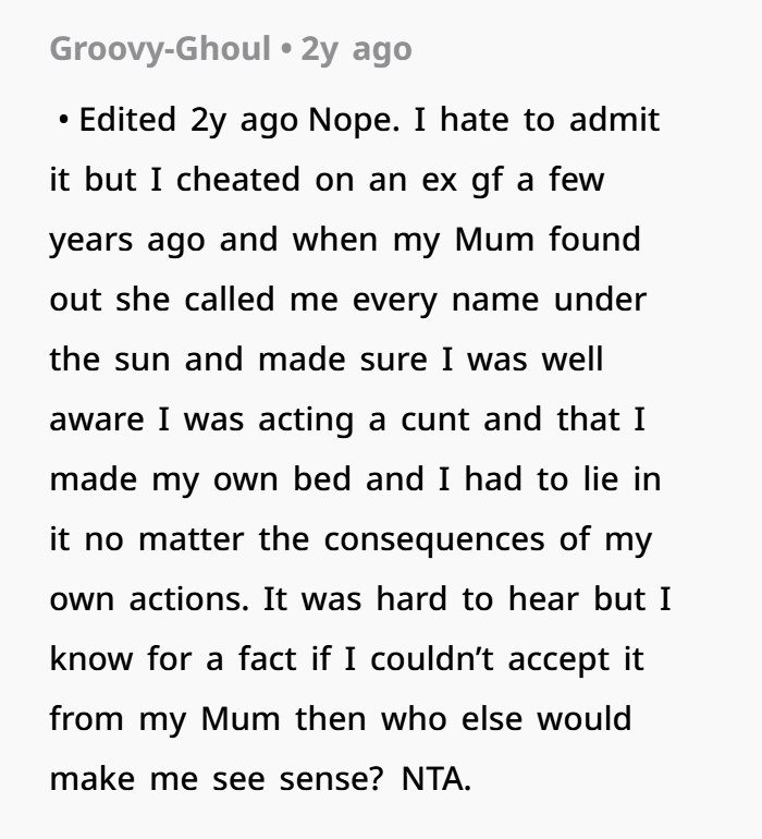 At the same time, though, many people would argue that tough love is sometimes necessary. Holding someone accountable for their actions, especially when those actions hurt others, is an essential part of personal growth. Accountability in relationships is an important life lesson, and Joseph’s mother, by calling him a disappointment, was likely trying to instill a sense of responsibility in him. She didn’t want him to think that cheating could be excused or justified — that’s why she reacted so strongly.