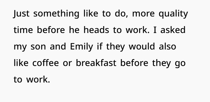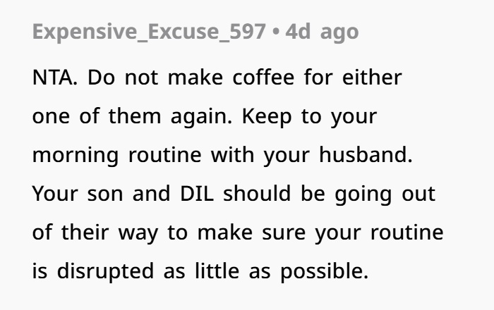 • Divide labour: Perhaps the DIL or your son can take certain mornings for coffee/breakfast prep, or both of you rotate.