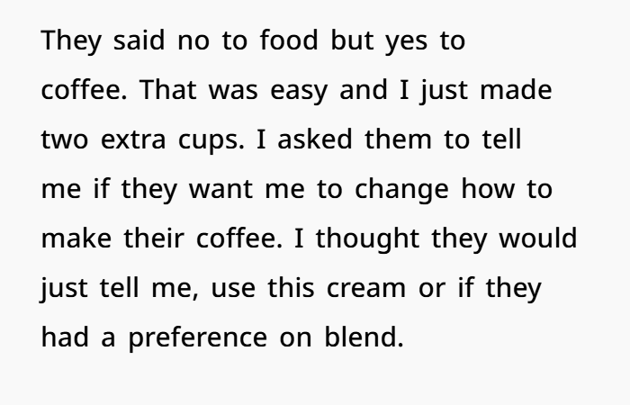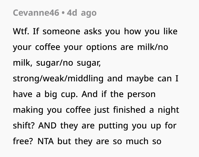 In your case: you are the host. You offered coffee/breakfast as a kindness, but the expectation turned into “make me exactly like I get at a café.” That is a shift from host‑kindness to service‑demand.