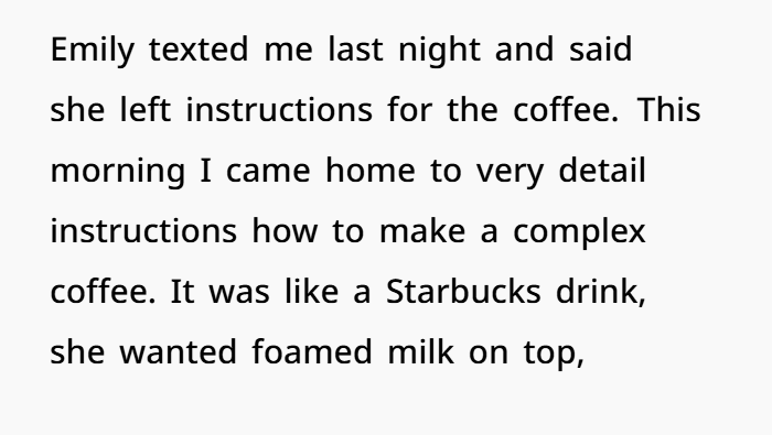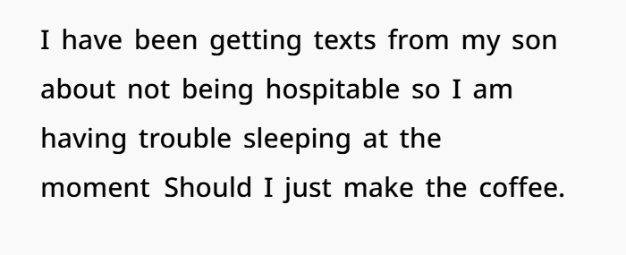 Simple enough. I asked if they had preferences—cream, blend, etc. Emily texted later saying she left instructions for the coffee. Next morning I found a detailed list: specific beans (fresh ground), a different brew method, foamed milk, syrups, etc. We only have a drip coffee machine. I made the usual coffee. Emily got upset and said I shouldn’t have offered if I couldn’t make it to her liking. My son says I’m being “not hospitable.” I feel like I offered something, but it suddenly became a barista‑service. Should I just make the fancy coffee?