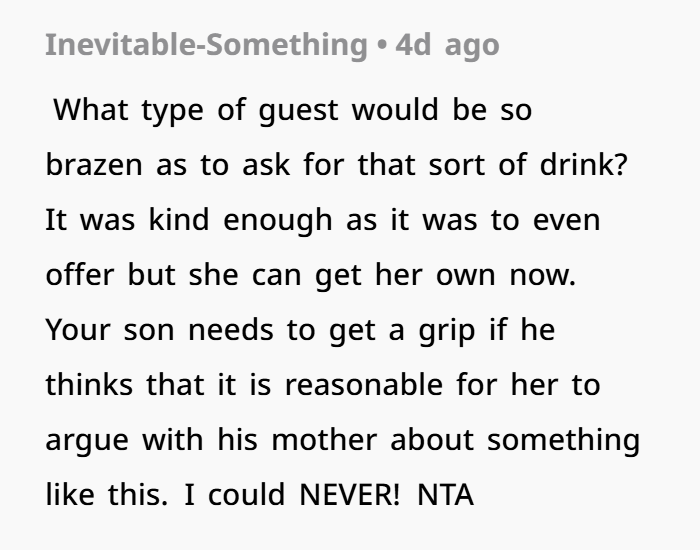 Your son says you’re “not hospitable.” That might come from the fact your DIL felt overlooked or that the offer felt conditional. It’s worth reflecting: did your wording of the offer perhaps imply a full service (“tell me how you like it”) when you intended a simple gesture? If yes, then it’s understandable she had elevated expectations. On the other hand, if she silently assumed details and then got upset, that’s also a mis‑step.