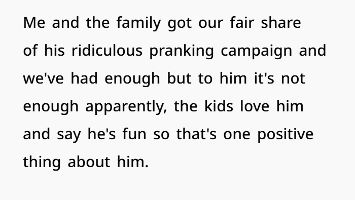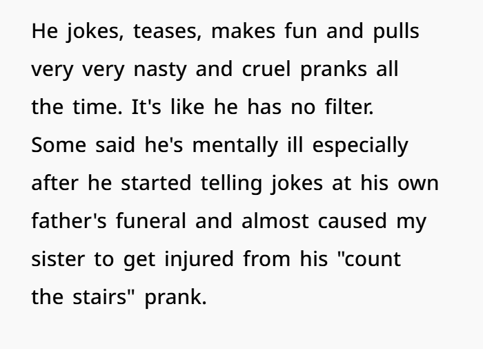 My sister just married one of those “it’s just a prank, bro” guys. You know the type. Loud. Always laughing at his own jokes. No filter. Thinks public embarrassment is peak comedy. He jokes at funerals. Pulls risky stair pranks. Pushes people’s boundaries and hides behind “relax, it’s humor.” Most of us tolerate him. Barely. The kids think he’s funny. The adults? We’re mentally drained. Because there’s a difference between harmless fun and straight-up attention-seeking behavior that ignores basic social boundaries.