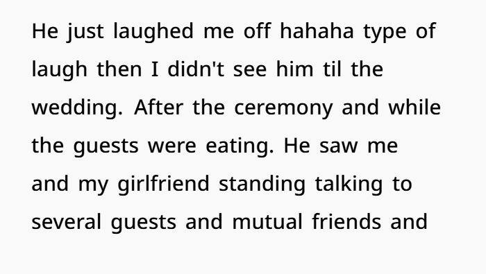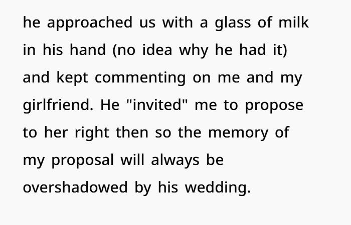 Don’t forget your girlfriend’s position either. She didn’t engage him. Didn’t tease back. Didn’t consent to being part of a joke. She was publicly embarrassed at a formal wedding reception. Weddings are photographed. Videographed. That moment could live online or in family albums forever. That’s not small.