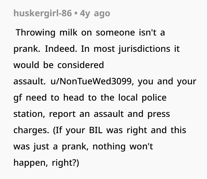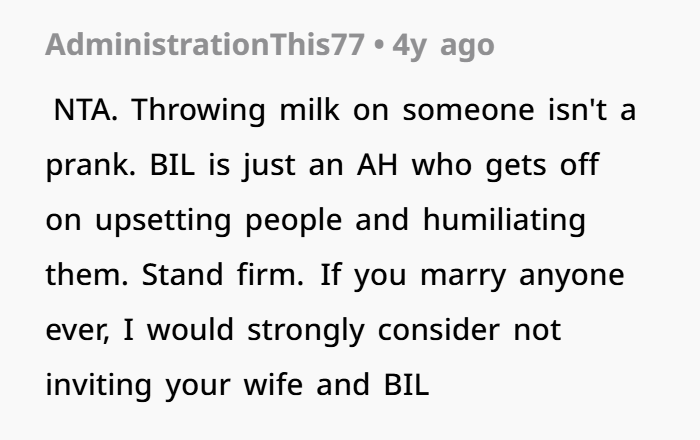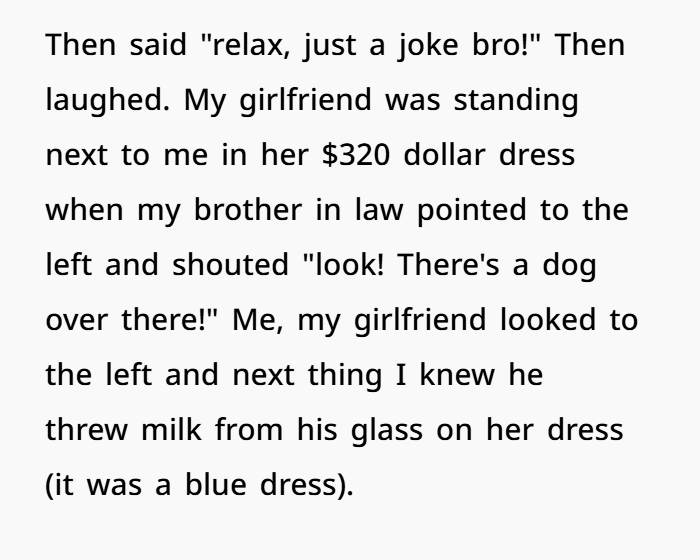 A man shared how his brother-in-law, the groom, took things too far by throwing milk on his girlfriend’s expensive dress as a prank