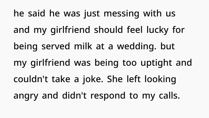 He Threw Milk on My Girlfriend’s $320 Dress at His Own Wedding Now I Want Him to Pay