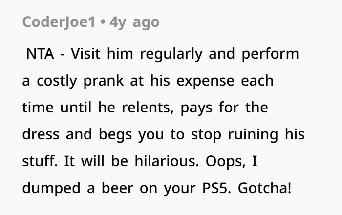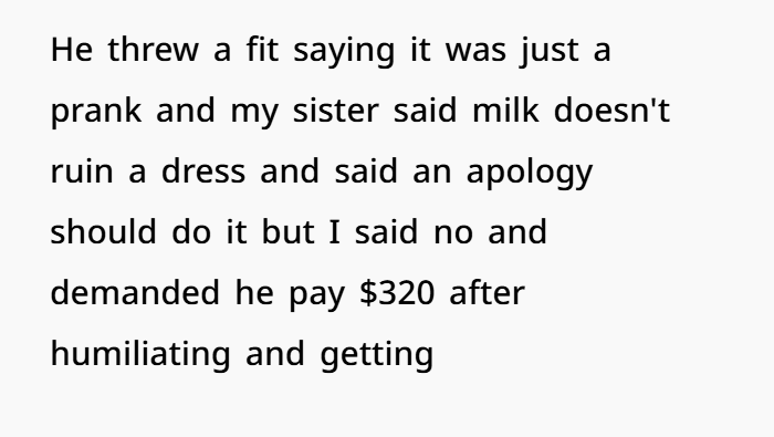 At the wedding reception, he locked in on my girlfriend like she was content for his imaginary prank channel. She was wearing a blue $320 dress her parents bought her. First time she ever wore it. He kept teasing us about proposing during his wedding, doing the whole “relax bro” act. Then he pulled the oldest distraction trick ever — pointed behind us yelling “look, a dog!” — and dumped a full glass of milk all over her dress. Right there. Middle of the reception hall. In front of everyone. Guests staring. Phones out. He laughed. She just froze. Then walked out. I told him he needs to reimburse the dress. That’s basic property damage responsibility. He says it was a joke. My sister says milk doesn’t ruin fabric, like dry cleaning is free or something. I say public humiliation plus intentional damage to someone’s personal property equals accountability. Now the family’s divided, and somehow I’m the problem for expecting him to act like an adult.