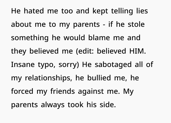 That wasn’t the case for a woman who spent her entire youth being bullied and harassed by her golden child brother
