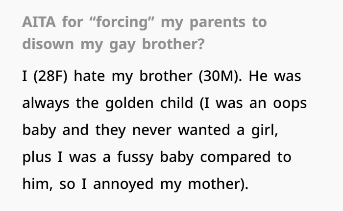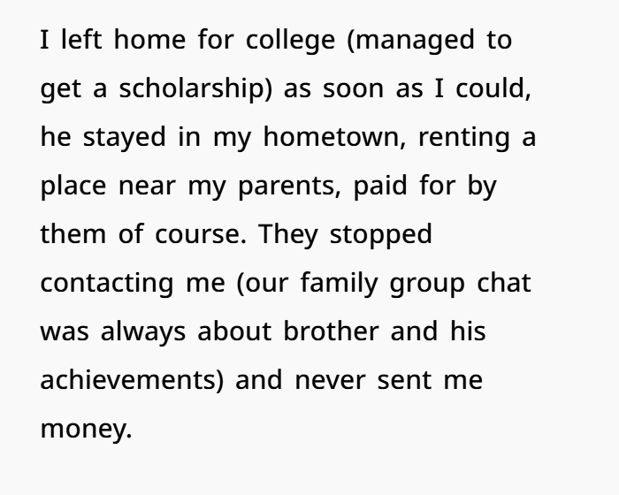 I (28F) have a brother, let’s call him Mark (30M). From the get-go, he was the “golden child.” You know, the one who could do no wrong, the one everyone adored. Meanwhile, I was considered the “oops baby” – I wasn’t wanted, and growing up, my parents always made me feel like a burden. They were disappointed when I was born (yeah, that stings to admit), and I was just… well, I guess not the easy child. In contrast, Mark was the picture-perfect son who could do no wrong.