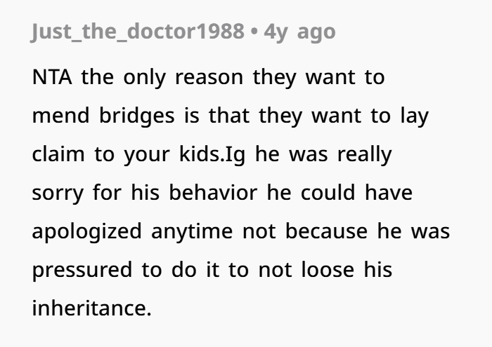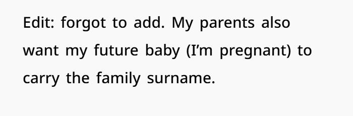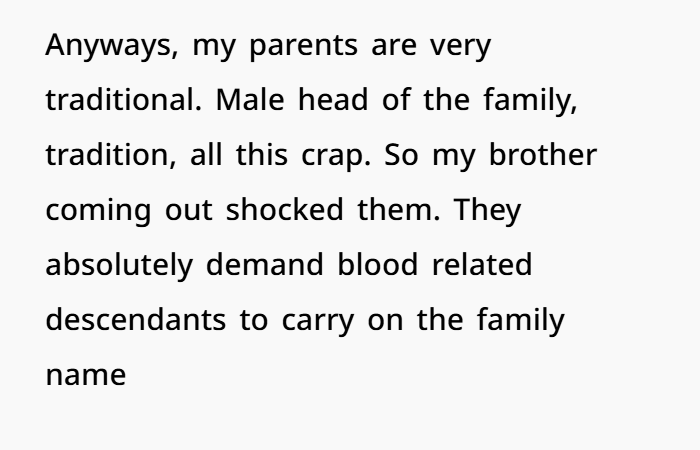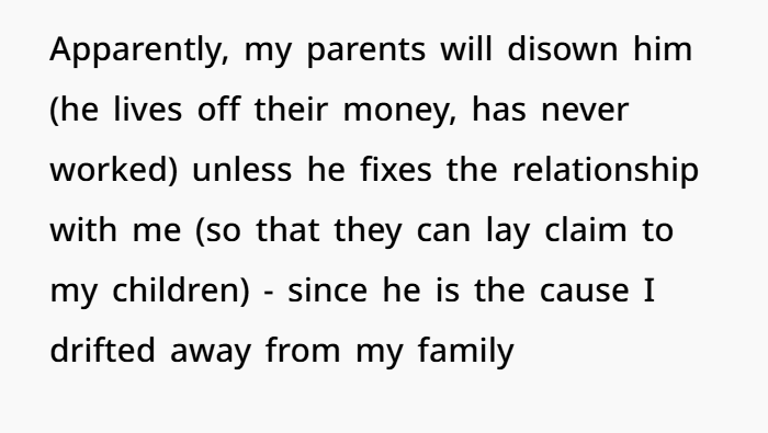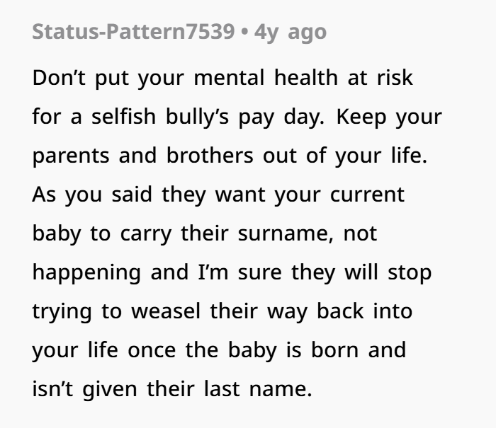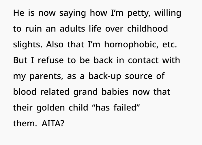 Now, Mark is saying that I’m “petty” and “ruining his life over childhood issues.” He’s even accused me of being homophobic because I won’t “support” him. But it’s not about that. It’s about the way he treated me for years and the way my parents have been manipulating me. They want my future child to carry their last name, and it’s clear that they only want me around because of that. I’m not going to fall for that.