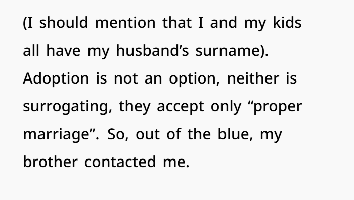 Out of nowhere, I get a message from Mark. Apparently, he’s come out as gay, and my parents are not happy about it. But here’s the kicker: they said they’ll disown him unless he fixes things with me. Why? Well, they’ve made it clear that they need me to have a relationship with him, so they can lay claim to my kids (who, by the way, don’t even carry their surname). Their whole thing? They need “blood-related descendants” to carry on the family name. Insert eye roll.