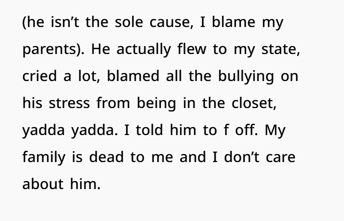 Mark flew to my state, and let me tell you, he was emotional. He cried a lot, blamed all the bullying on his stress from being in the closet, and begged me to forgive him. I honestly didn’t know what to think. He’s never apologized for anything he did to me in the past, and now suddenly, he’s claiming everything was because of the pressure of being closeted? I don’t buy it. My parents have treated me like garbage for years, and now they’re only interested in me because their “golden child” is no longer playing by their rules. It’s honestly just so messed up.